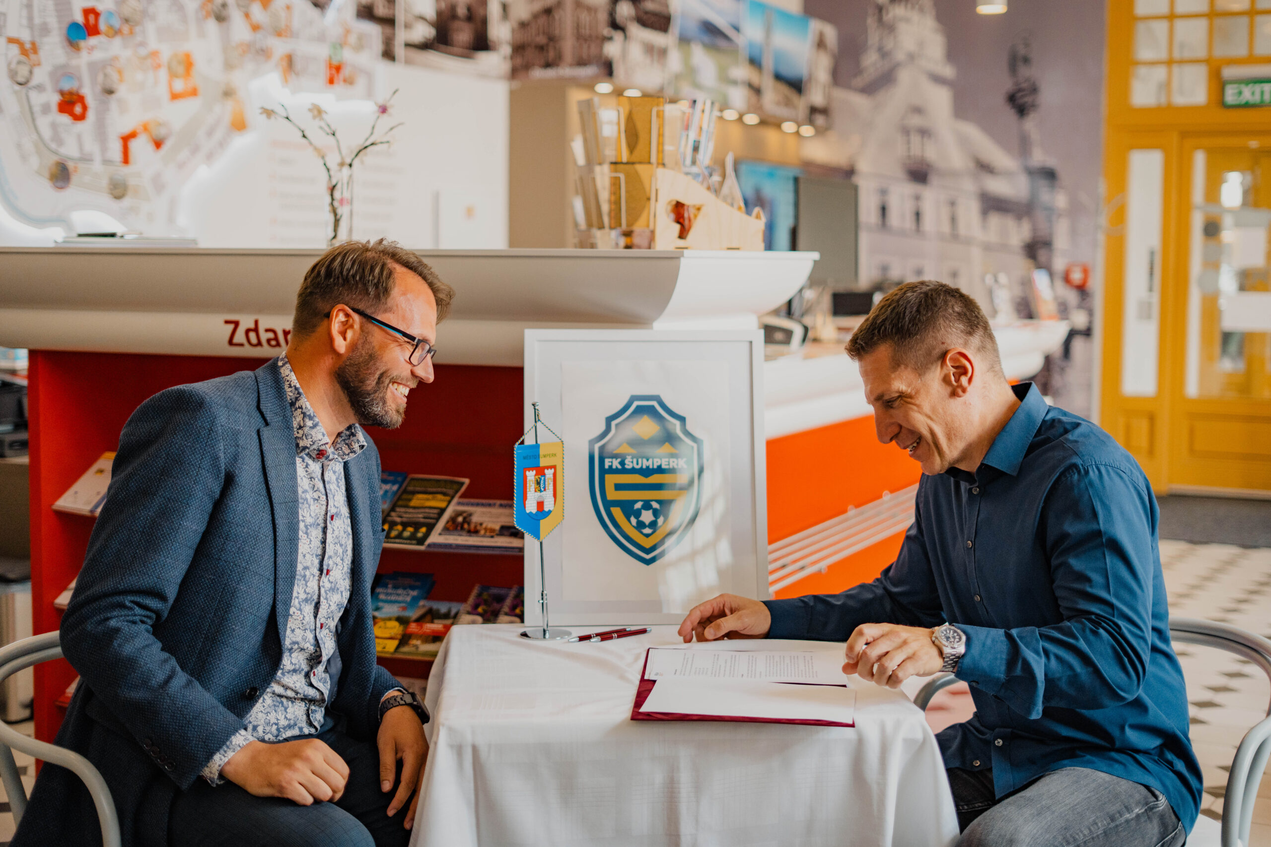 Šumperský fotbal tak po 80 letech v místech, kde po válce znovuobnovovali nadšenci činnosti fotbalového oddílu pod hlavičkou SK Šumperk. Na slavnostní událost pozval náš tým také zástupce stávajících partnerů, účasten byl například starosta města Mirek Adámek, šéf šumperské nemocnice Martin Polach, ale i autor nového loga klubu Martin Král. Důstojná a povedená akce v krásných prostorách šumperského infocentra.